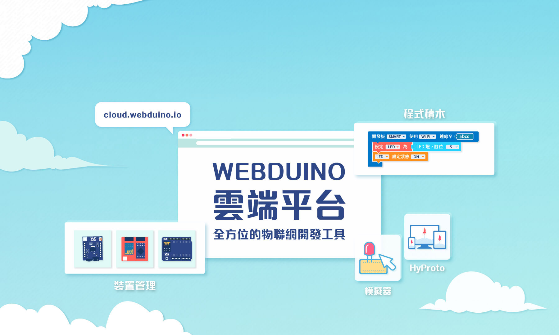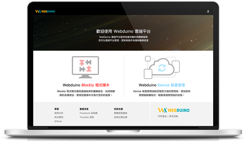 WEBDUINO = WEB + ARDUINO。我們簡化複雜的網路技術,研發能夠讓使用者從零開始學習物聯網的友善平台,打造臺灣 AIoT 程式教育第一品牌。