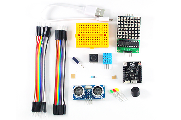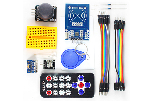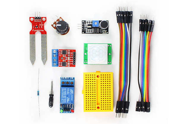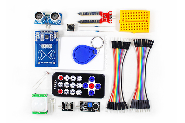 入門的零件材料包,可從中學習到基本的電子電路,從點亮一顆 LED 燈開始,到自由操控七彩霓虹燈,從玩轉按鈕開關到用超音波傳感器控制 Youtube 影音播放、甚至可以偵測溫濕度來開啟風扇等。